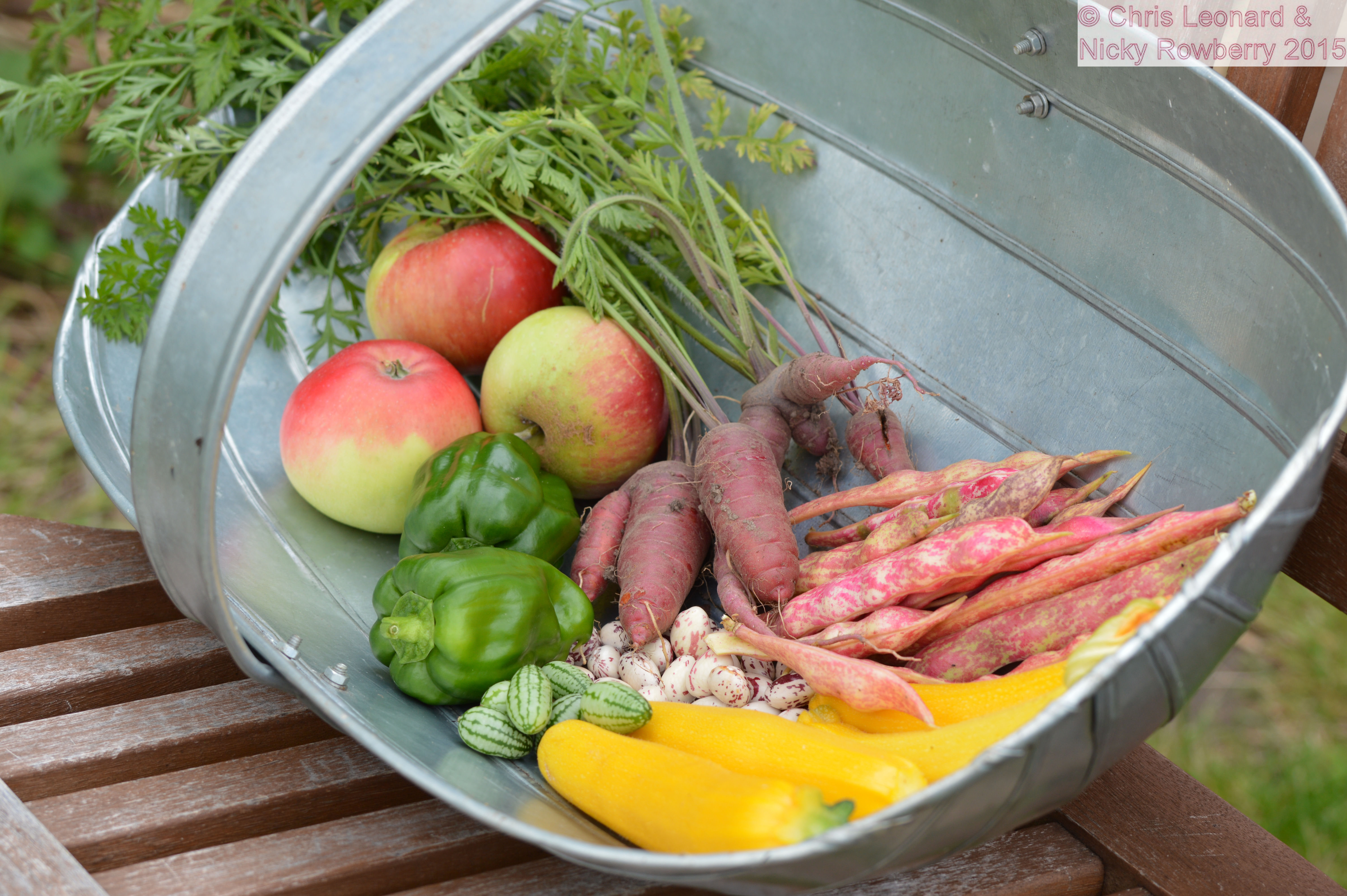 Behold the bounty from a lazy organic garden! We’re a long way from being self-sufficient and I’m not quite sure what we’re going to make out of this particular combo of apples, vaguely rude carrots, peppers, courgettes, borlotti beans and a handful of cucamelons, but it does go to show that you can still grow edible stuff without resorting to pesticides. Of course we are also growing a lot of greenfly, slugs and caterpillars (the Large White butterflies in particular have a penchant for kohlrabi it seems), but their need is probably greater than ours. We should also get a good crop of blackberries if the birds don’t beat us to it and chillies if I remember to water them in the greenhouse.