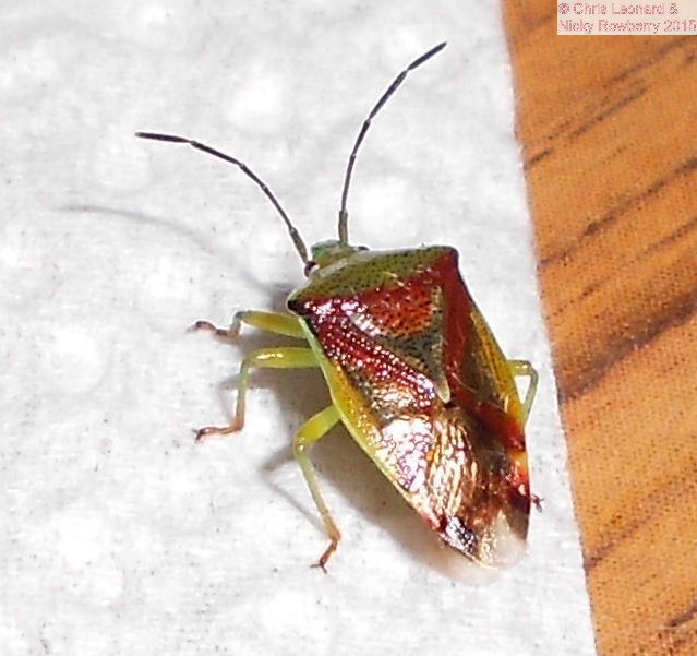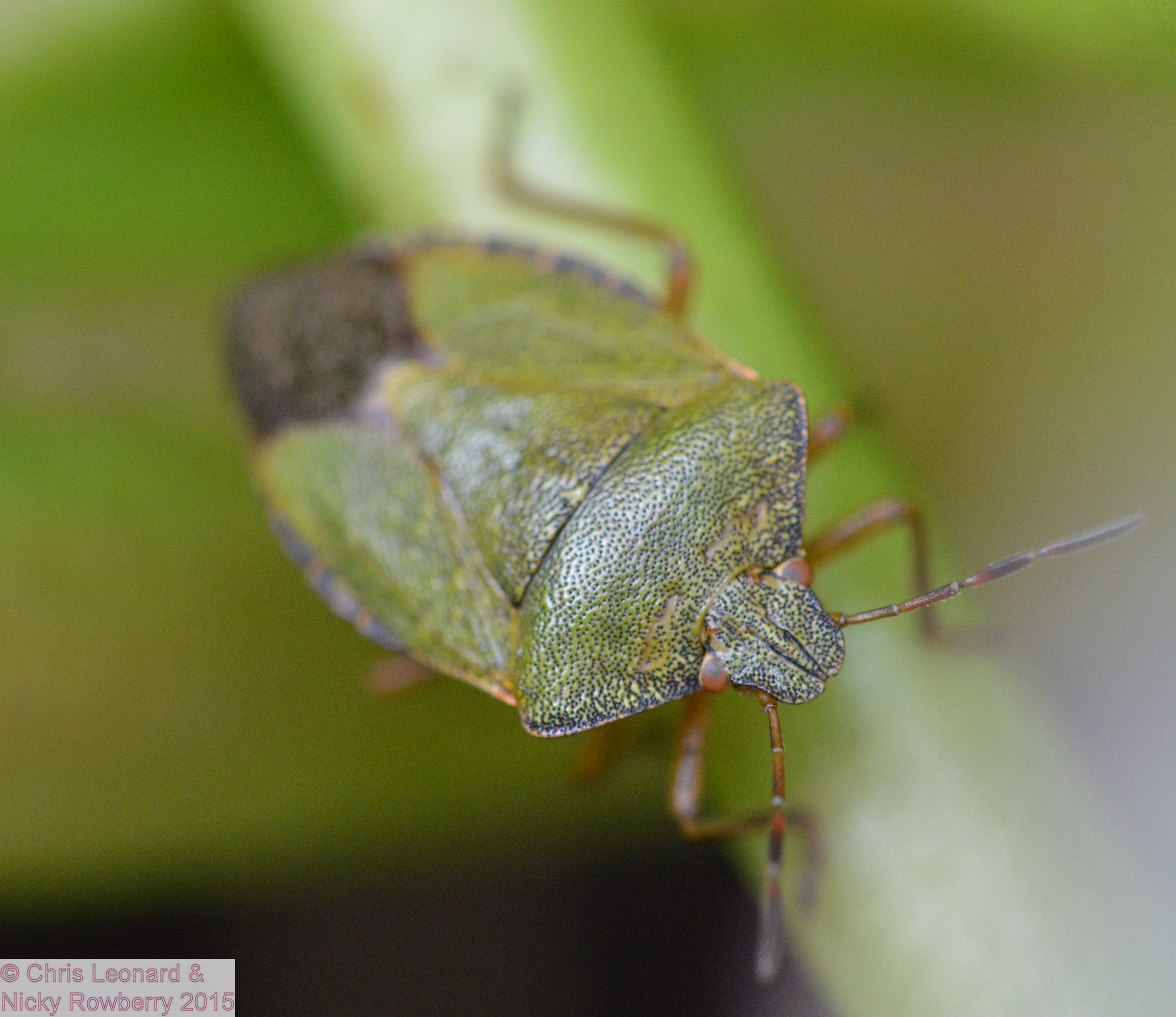 I think the shield bugs must be one of my favourite groups of insect. There’s something about them; they look so determined waddling around like minute clockwork toys. When they fly they make a loud whirring noise out of all proportion to their size and have a habit of landing on me if I wear green in the garden (must stop wearing that Robin Hood outfit!) Besides my prized Box Bug from a previous blog post, we’ve recorded 6 other species in the garden – all cute little characters in their own right. By far the most common is the Green Shield Bug. Their exoskeletons are leathery with small dark pits all over them. In the spring and summer they are green like the one below, but in the autumn and winter they turn a bronze colour.
