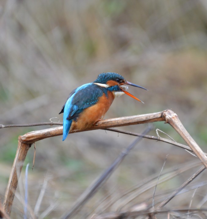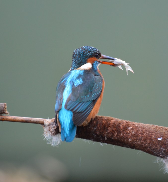 Turns out I needn’t have worried. An absolutely stunning kingfisher arrived fairly quickly and sat on the bulrush perch. It then moved to one side to sit on the reeds. He (or she) then proceeded to sit in the same spot for about 25 minutes. It was there so long, we actually started to get a bit tired waiting for it to do something different! (never could have imagined before that I might tire watching a kingfisher, not that I’m complaining) But it gave us plenty of chance to take loads of photos – here’s just a very small percentage of the ones we took.