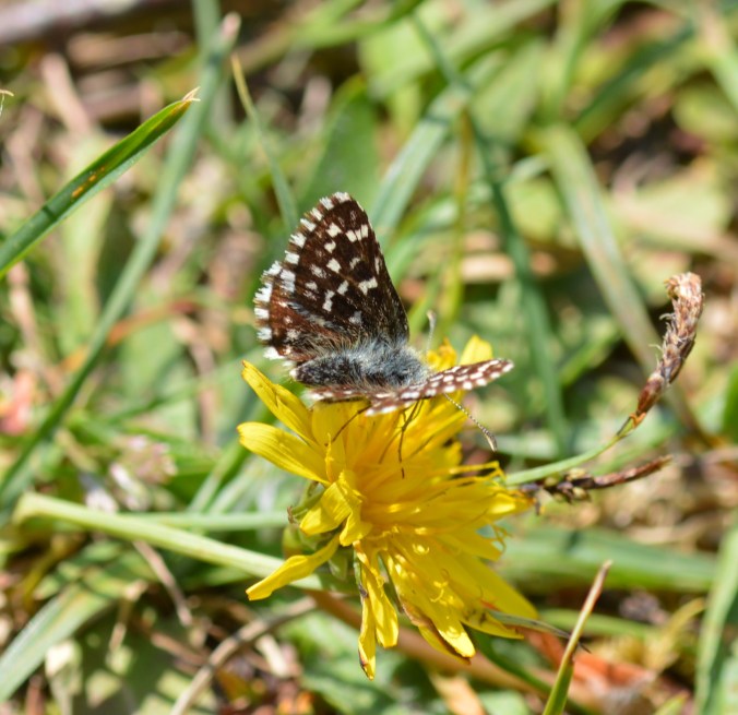 My first ever Grizzled Skipper wasn’t unfortunately a pristine specimen, looking a bit ragged at the edges, but it was what I came looking for, so I took loads of pictures.