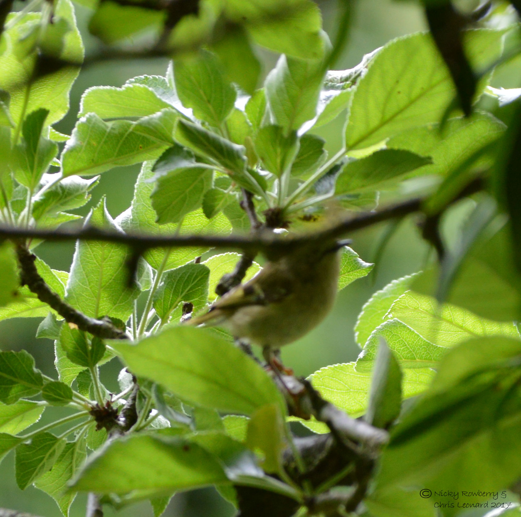 In the morning I had also seen magpies, wrens, robins, blue tits and pigeons – in the afternoon – zilch, zippo, nada! Then just as I was about to give up on them all – a total surprise. I was leaning against another old apple tree (Dad’s house was built in an old orchard) when a Gold Crest suddenly appeared just a few feet in front of me. By the time my brain registered what it was, it had already spotted me and started to move, so I only managed this one rubbish shot. You’ll probably have to take my word for it that he was indeed a gold crest, since the key bit – i.e. his crest, is hidden by a twig. Still his appearance made up for the absence of everything else. I grew up in that garden and don’t ever remember seeing a gold crest before, so it was a real treat.
