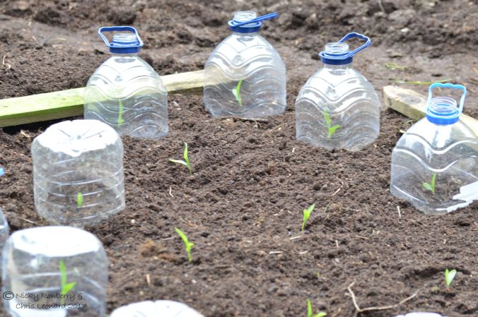 We’re trying to be as environmentally friendly (and economic) as we can, so are using recycled stuff where possible. The cloches over our sweetcorn are old water bottles and we’ve turned other old bottles into plant pots that are hung on the fence.