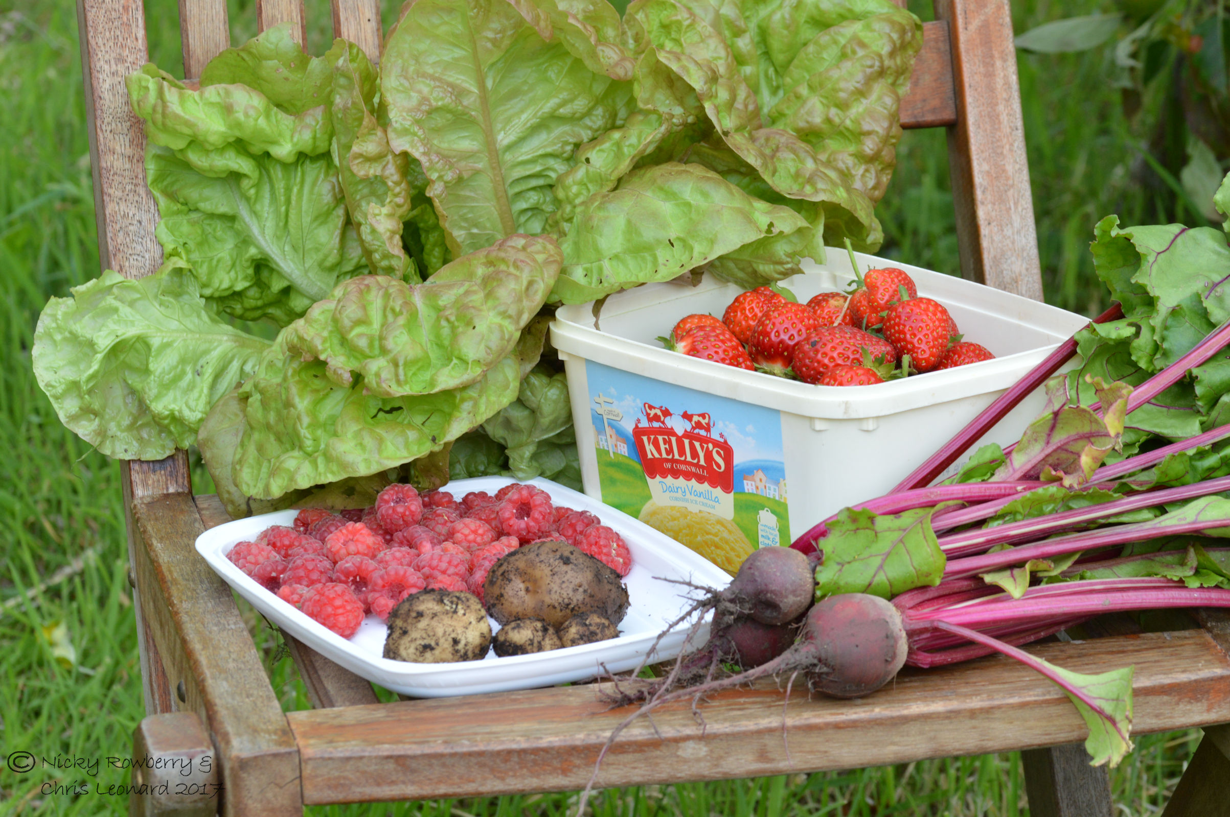 By gardening organically we’ve accepted that some of our lettuce will get munched by slugs and some of the fruit will be eaten by birds, but there’s still more than enough for our two households. This was today’s harvest – good to know that it is all pesticide and guilt free!