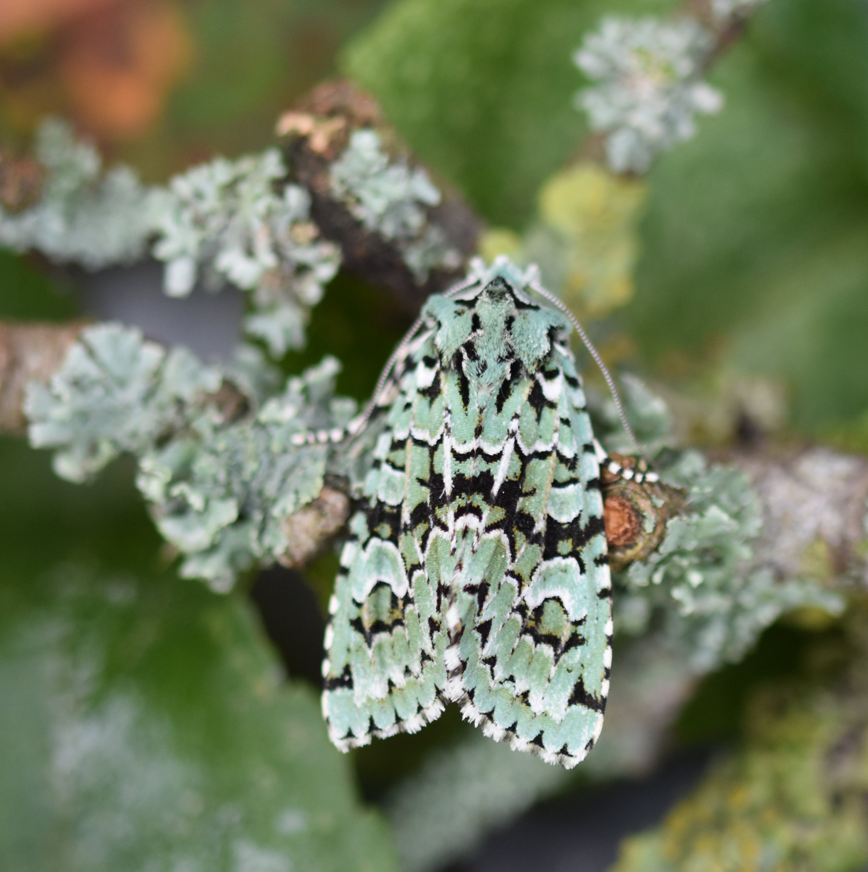 Emptying the moth trap last weekend at the crack of dawn, I could hear the frogs croaking in the half-light, while the garden was swathed in a light mist, spider webs draped around the trees glistening with dew – made me feel like I was deep in the Louisiana swamps (I have an active imagination at that time of day it seems). But the strange atmosphere was all forgotten when I spotted a Merveille du Jour; a French name for a beautiful British moth whose name means Wonder of the Day. I’d been wanting to see one of these little beauties for ages and been growing increasingly envious (moth envy is a terrible thing) of photos posted on Facebook showing Merveilles sitting beautifully camouflaged on green lichen. Of course my little wonder refused point blank to sit on the perfect bit of lichen I found on the apple tree, preferring instead to crawl up a brown twig – no sense of artistry!