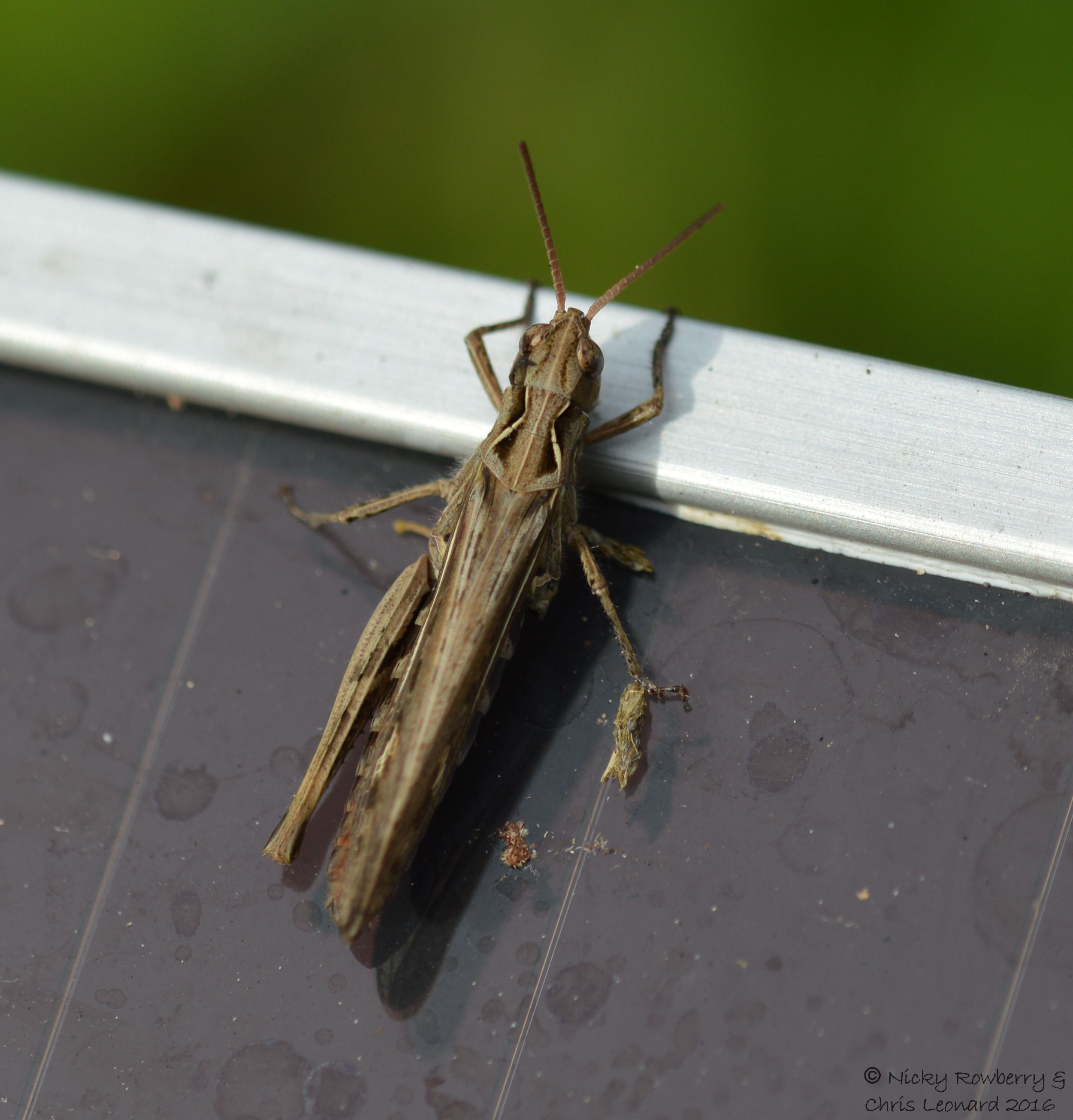 Since I wasn’t immediately inundated with the desired bees, I spent time observing the other insects. There was a surprising amount around considering it is now technically autumn. This grasshopper may have been missing one back leg, but it was making the most of the sunshine, sitting on top of one of the solar panels for the pond pumps.