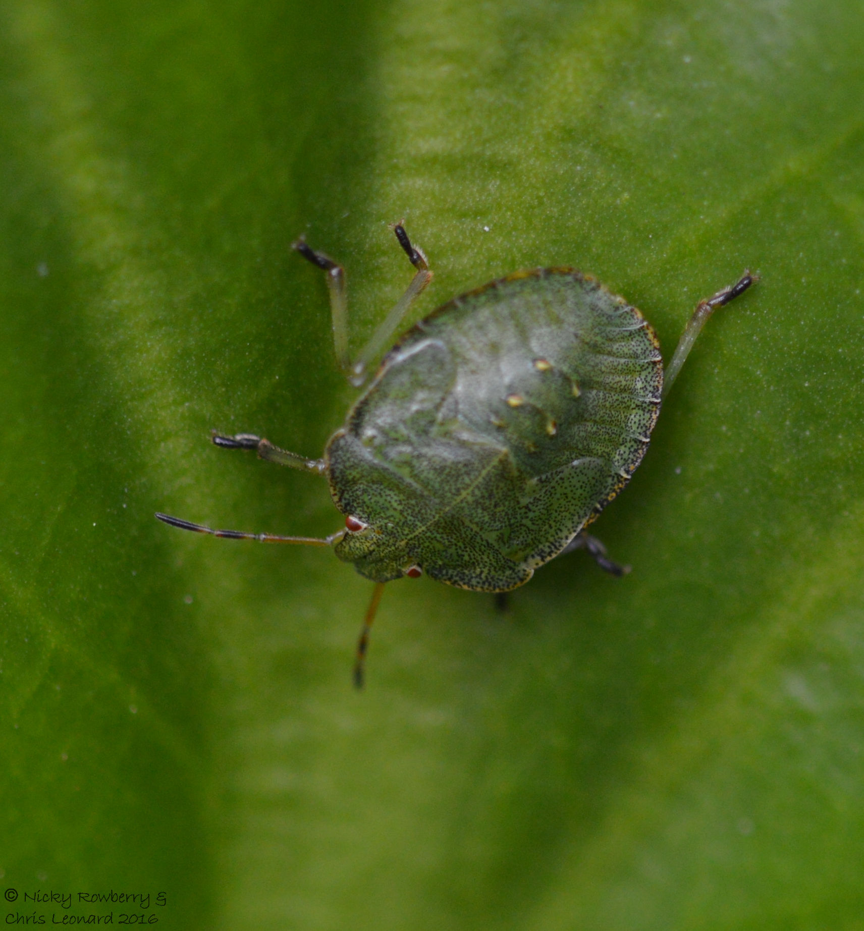 There were also a few Green Shieldbug nymphs, of varying stages, meandering about the leaves at my feet, with at least one adult visible but out of photographic range.