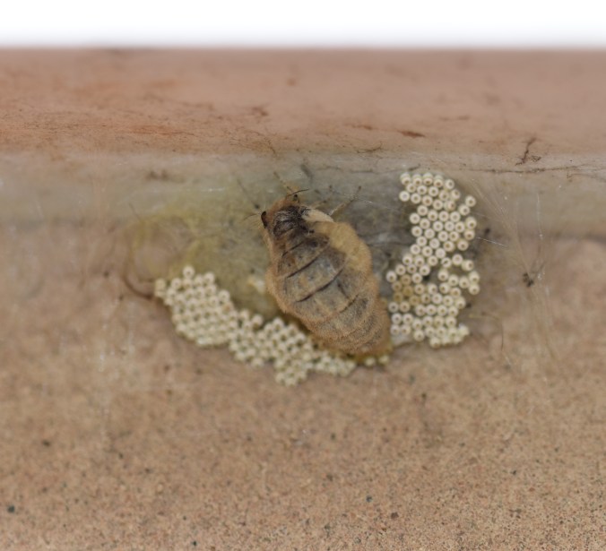Another mothy highlight was finally getting to see the flightless female vapourer moth and not only that, but getting to watch her laying eggs on our garage wall.