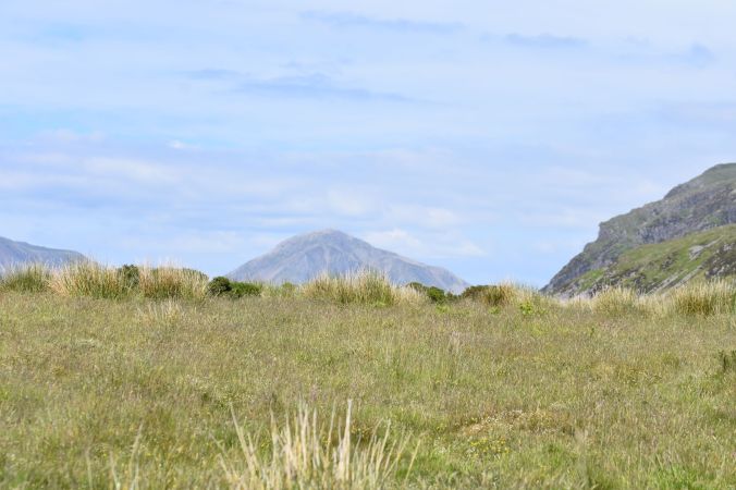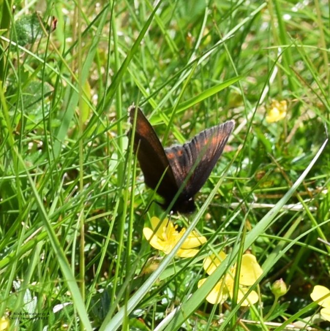 As with the Northern Brown Argus, the Mountain Ringlet is small and fast. Fortunately its chocolate brown colour stood out well against the grasses and heather when it was flying; but once it went down into the grass it was virtually impossible to find. I saw quite a few of them but most eluded the camera. So the best I managed was this – blurry, but just about recognisable as a Mountain Ringlet –  hastily taken before it shot off again.
