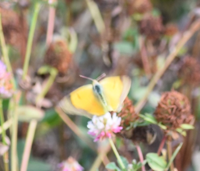 In other news the local Facebook groups were buzzing with the news that there were multiple Clouded Yellow butterflies down in the fields near Grafton Wood. As usual I could resist anything but temptation, so headed down there to see for myself. First attempt was a complete wash-out as I picked the only cold cloudy day in August, but second attempt was more productive. Together with a very nice couple I met down there, I watched in frustration as the bright yellow flashes of several Clouded Yellows dashed about the centre of the fields. Not wanting to trample across the farmer’s fields we could only watch and hope they would eventually come to the margins. Eventually a few did, but they were so flighty that all I managed was these blurry yellow blobs for photos. But at least I saw them.