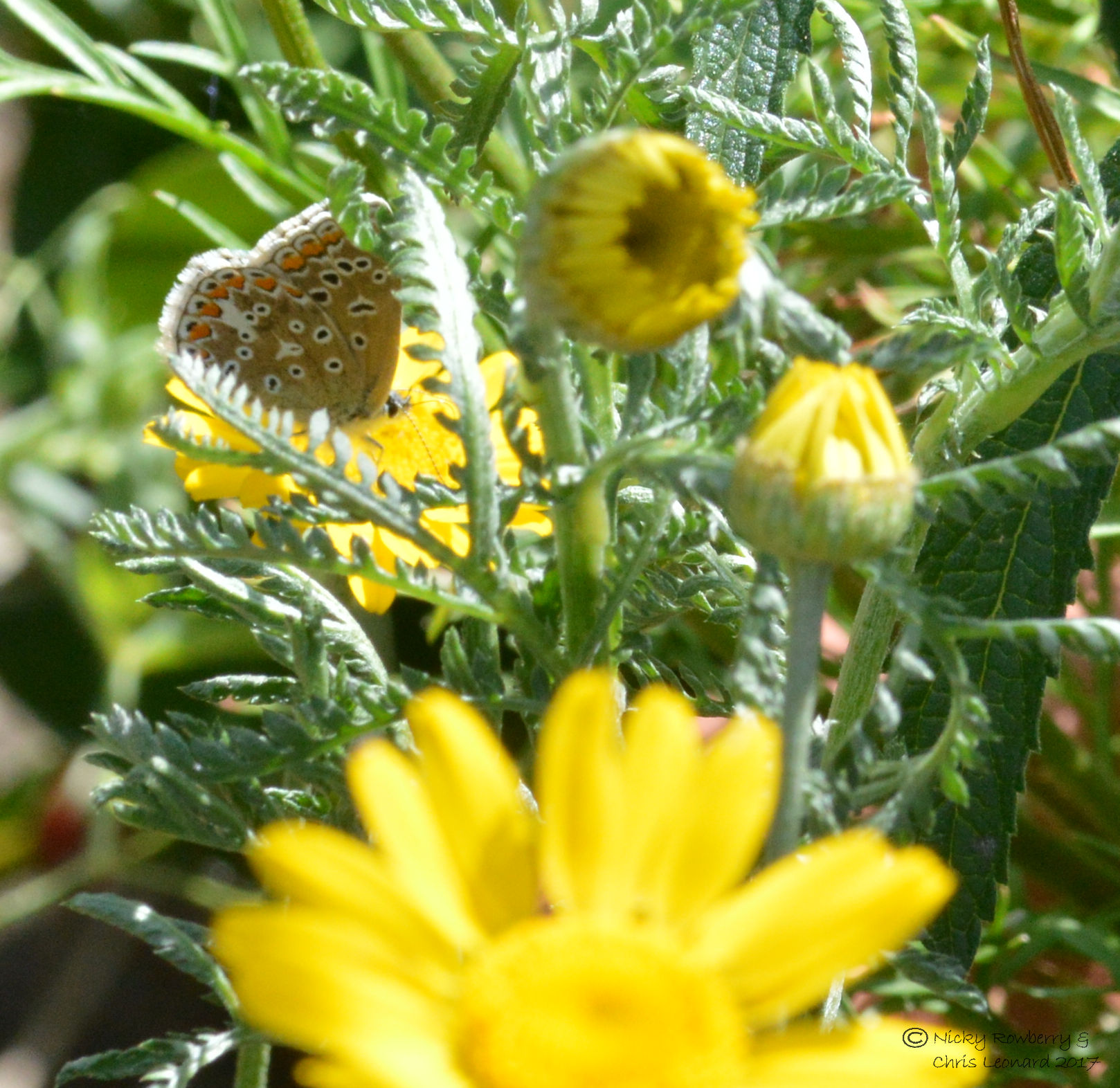 Then a couple of weeks later we were sitting by the pond (as so much of 2020 has been spent) when a small butterfly landed on the Eryngium flowers. We thought at first it was a female Common Blue, which in itself would be a bit of a rarity in the garden, but it turned out to be a Brown Argus – our 20th butterfly species for the garden.