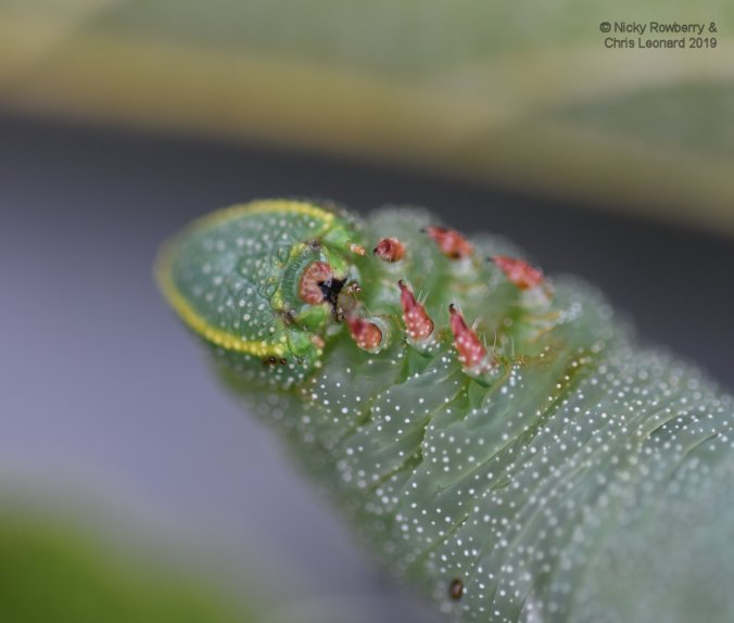 In this close up of his head, you can see his true feet, used for gripping the leaves. His black jaws are just about visible in his mouth.