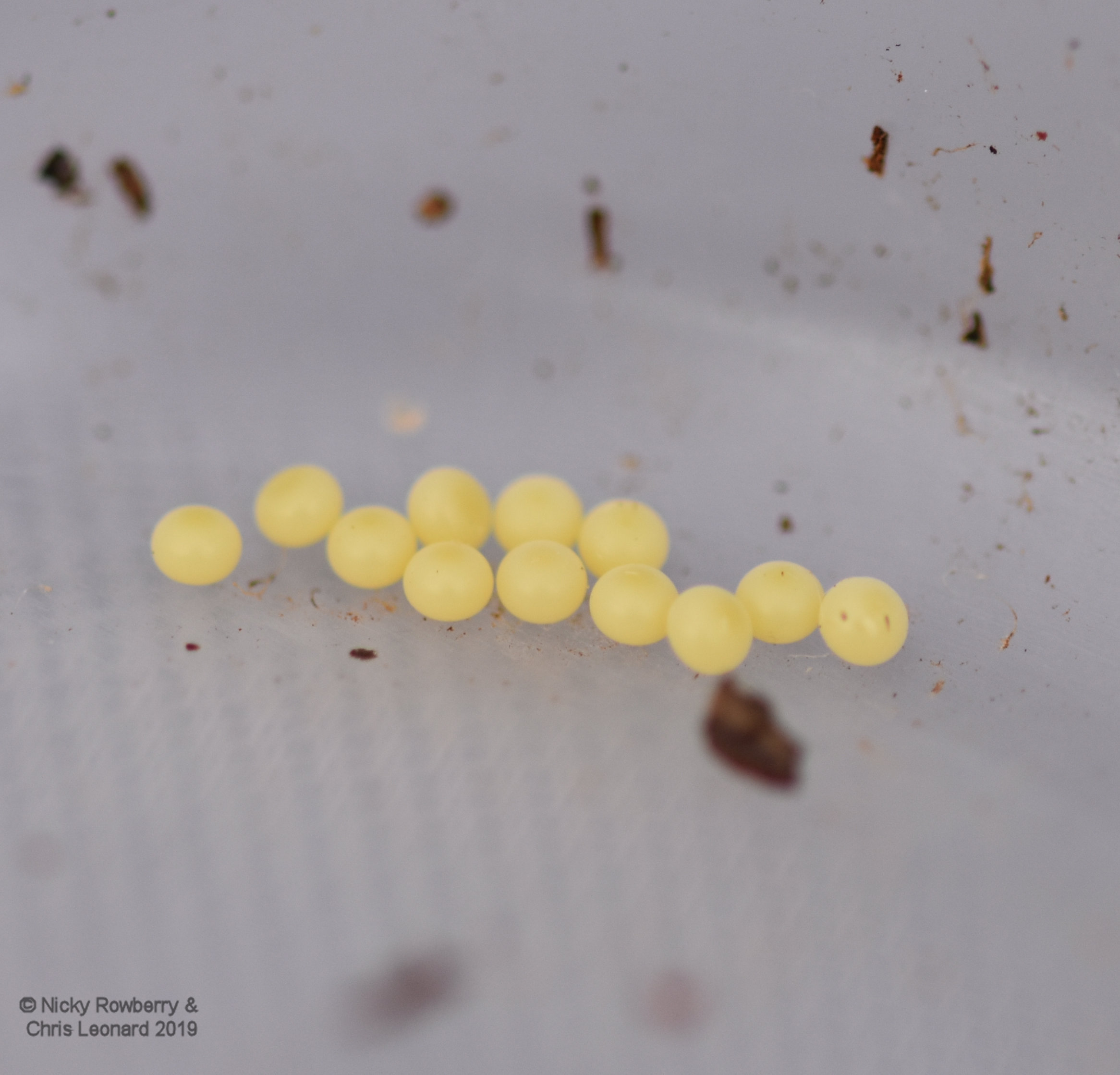 When I came to photograph and release her I found she’d laid two perfect green eggs in the pot.
