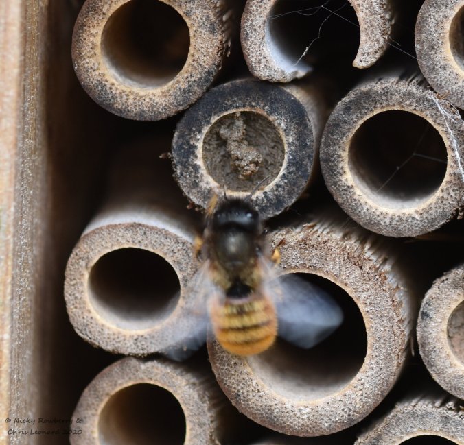 Once mated the females start filling up the bee hotels with the next generation. Each egg is provisioned with fresh, bright yellow pollen and sealed in its little mud chamber.