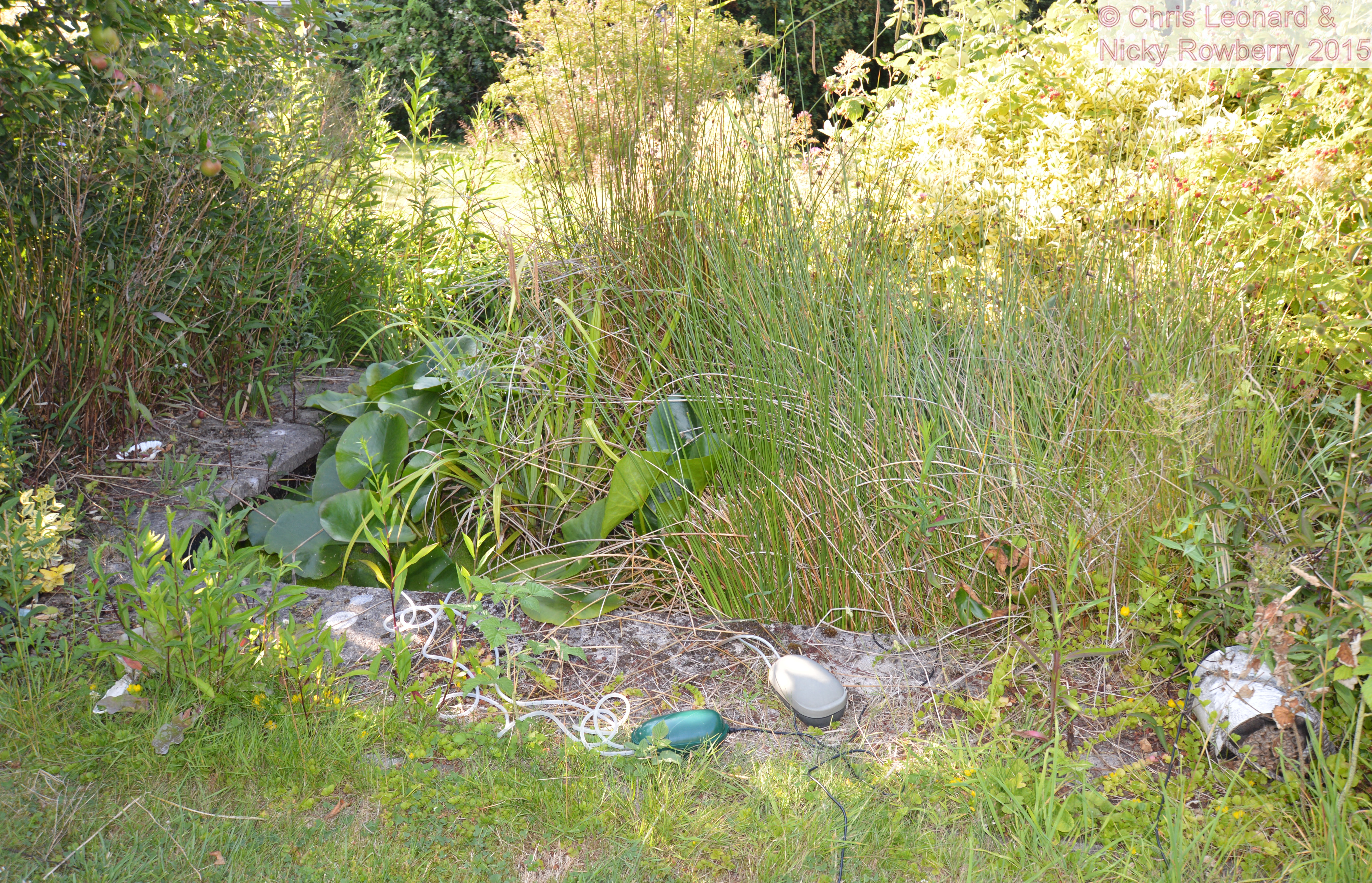 Well to call the original pond a pond these days is stretching the definition of “a pond” a bit. It is more of an enclosed rectangle of soggy loving weeds growing out of a layer of damp gloop. There is however just enough liquid left on top of the mud to support a few brave invertebrates. We inherited this pond when we bought the place and for many years I intended to dig out a “proper” pond; but along with being too lazy to weed, it turned out I was too lazy to dig as well! Fortunately I have a friend (Gwyndaf) who is less lazy than me and who has very kindly created a new and much better wildlife pond for the garden.